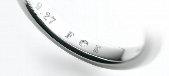 定番の「メッセージ、刻印」。ふたりの名前や、入籍日の日付などのほかにも、愛を感じられる短いメッセージ、リングの内側に刻印して、愛の誓いとするカップルに人気があります。
