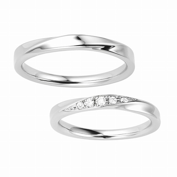 最高純度のプラチナに、しなやかなひねりを入れたデザイン。女性のリングはダイヤモンドが煌めきます。高品質プラチナだからこそ感じられる艶やかさが、シンプルながら存在感を際立たせるリングです。
