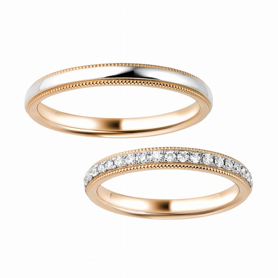 プラチナとピンクゴールドで肌なじみの良い色合いのマリッジリング。男性用のリングはミル打ちデザイン、女性はハーフエタニティリングで、お二人の指を静かに彩ります。繊細なドットデザインとダイヤモンドがいつまでも続く二人の時間を見守ってくれそうです。