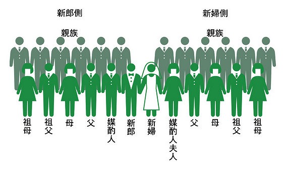 新郎新婦を中心に、媒酌人、カメラから見て左側に新郎側、右側に新婦側の両親、祖父母、兄弟姉妹などが前列に座り、後列には親戚や友人などが並びます。
