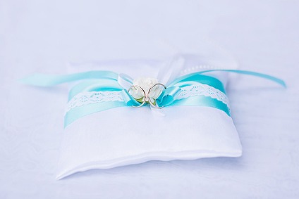 結婚式に、何か青いものを取り入れると永遠に幸せになれるという「サムシングブルー」のおまじないを取り入れたリングピロー。