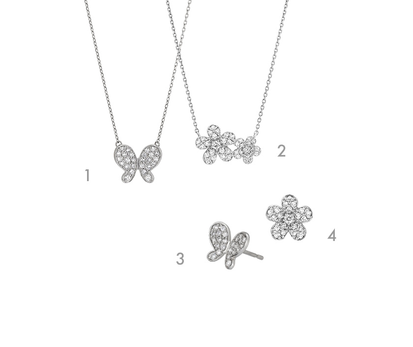 パヴェセッティングでダイヤモンドを隙間なく敷き詰めた、ロマンティックなフラワー・バタフライモチーフ。ふんわりとした花びらを表現した立体的なデザインからは美しい花々の生命力が感じられ、思わず周囲の視線を惹きつけます。バタフライモチーフは羽に角度を付け、今にもひらひらと飛んでいきそうな躍動感のある蝶の姿を表現。丸みのあるフォルムで可憐な雰囲気がありながらも、しっかりと存在感を放ちます。