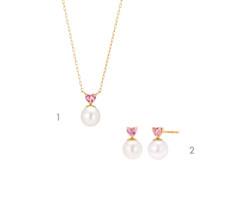 ハートシェイプのピンクトルマリンにパール(真珠)を組み合わせた、愛らしいシルエットのネックレスとピアス。