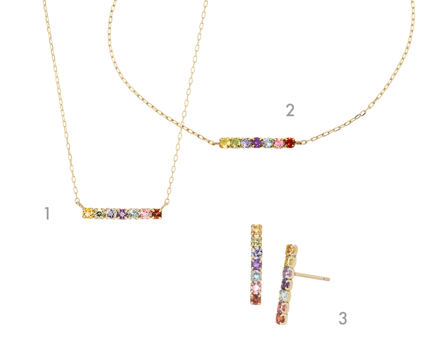 七色の虹のように色鮮やかな宝石が、直線に7石並んだネックレスとブレスレット、ピアス。