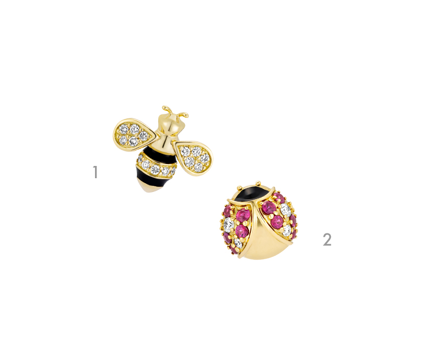 幸運を呼ぶといわれる、ミツバチ・てんとう虫モチーフの片耳用ピアスとピンブローチ。ダイヤモンドやルビー、エナメルなどを用いて細部まで表現し、今にも飛び立ちそうな生き生きとした様子が感じられるデザインです。ほかのジュエリーとの組み合わせで、大人の遊び心に富んだコーディネートをお楽しみいただけます。ミツバチは巣の中に蜜を貯めることから 「金運」「繁栄」「勤勉」の象徴ともいわれています。また、てんとう虫は太陽に向かって飛んでいくことから、日本では「天道虫」とも呼ばれ、縁起の良い存在とされています。自分の願いを託して、お守り代わりに身に着けるのもおすすめです。