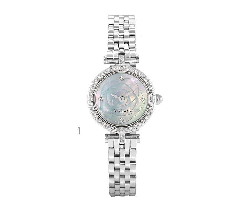 緩やかなドーム状のサファイアガラスのフェイスと文字盤の柔らかい雰囲気に合わせ、ベルトはしなやかで上品な5連のステンレススチール仕様にしています。